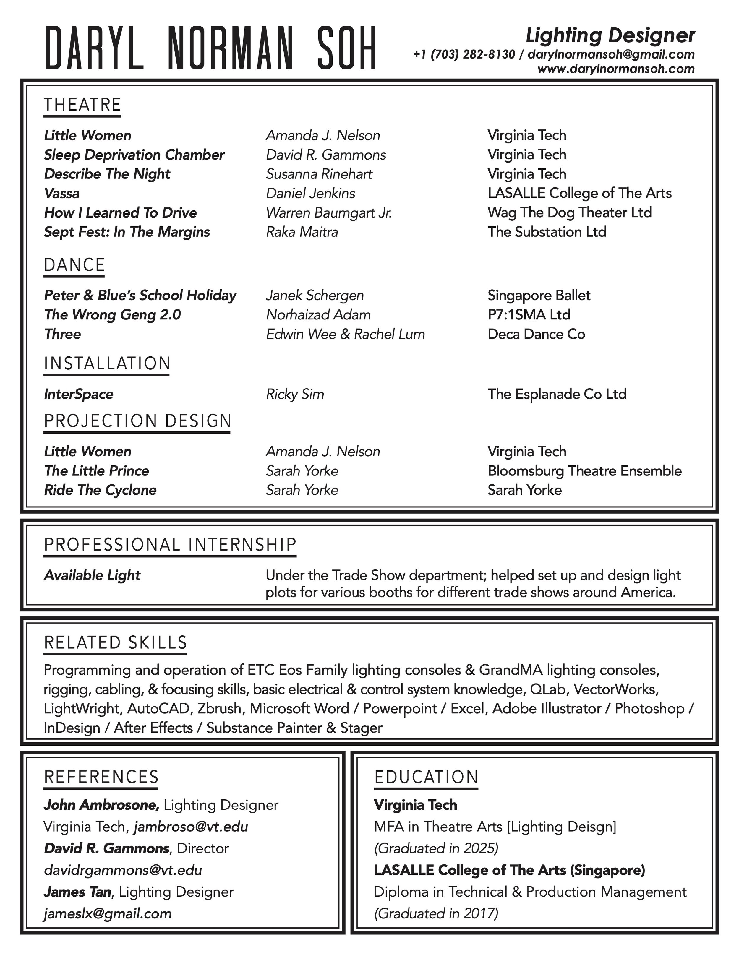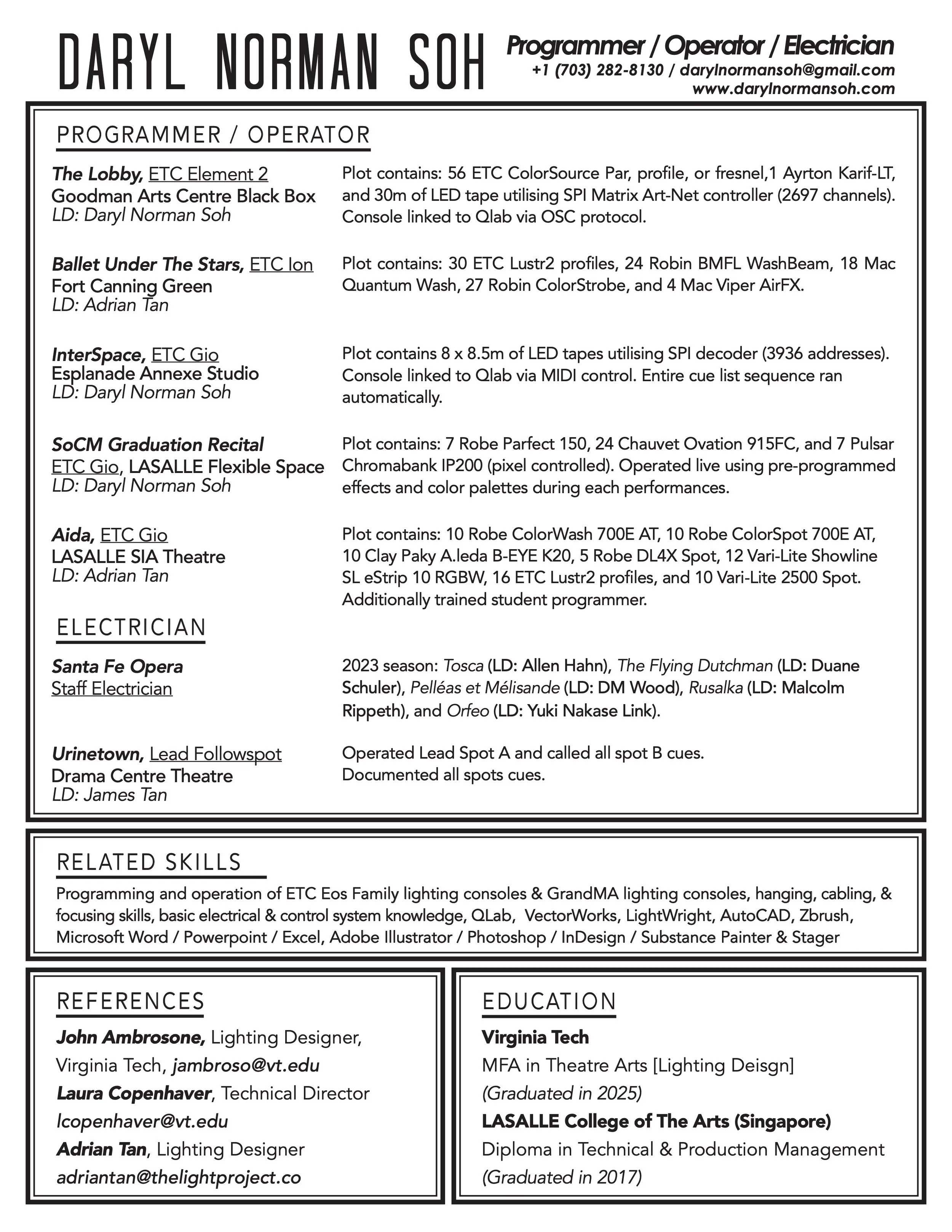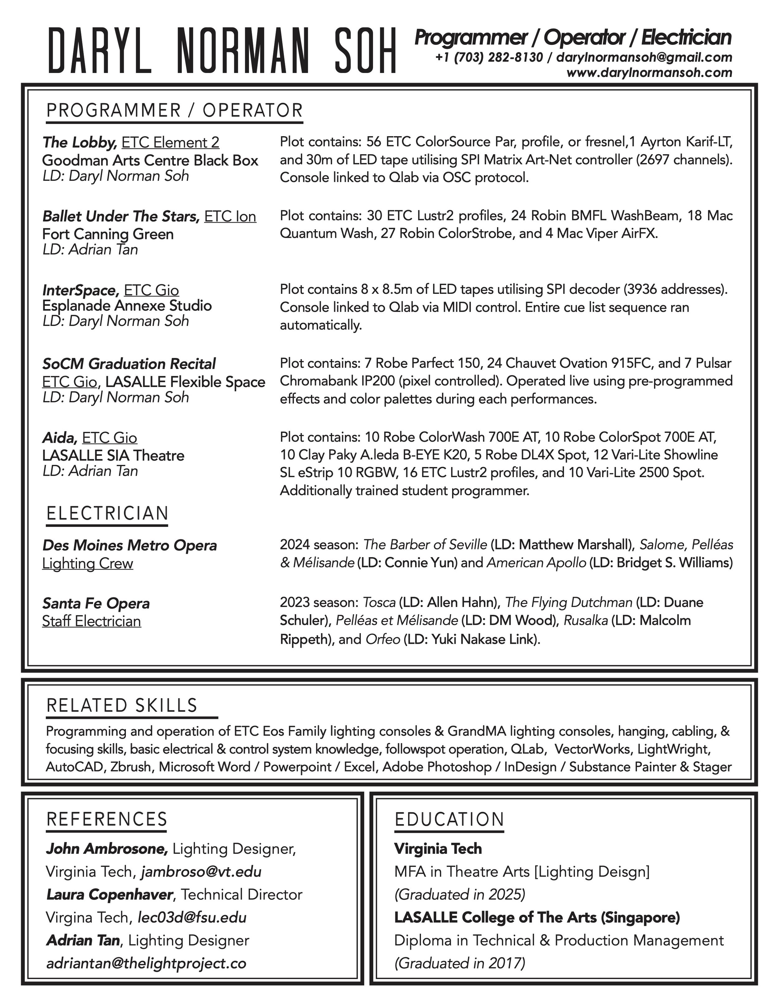 Daryl received his MFA in Theatre Arts, Lighting Design at Virginia Tech and is currently pursuing his 2nd MFA in Creative Technologies at Virginia Tech. During his time in the US, Daryl was glad for the opportunity to work with prestigious companies such as Santa Fe Opera, Des Moines Opera, and Available Light.